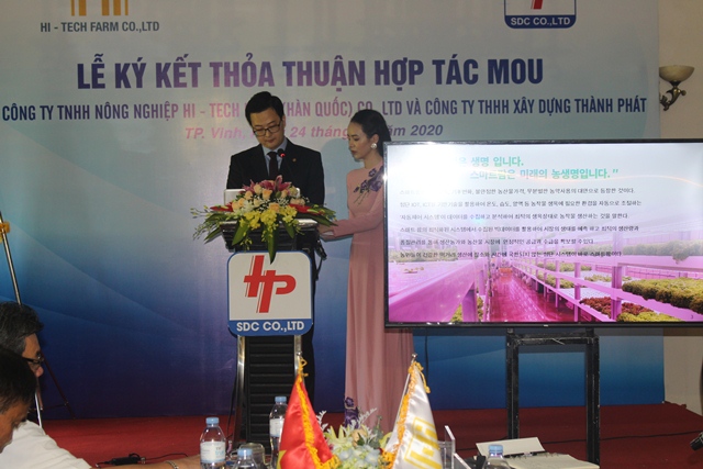 Phát biểu tại Lễ ký kết, ông Hoàng Nghĩa Hiếu, Phó chủ tịch UBND tỉnh Nghệ An nhấn mạnh: “Trước hết, thay mặt lãnh đạo tỉnh, tôi nhiệt liệt chào mừng ông KO YOUNG HAK – Chủ tịch Tập đoàn Royal K Hàn Quốc và ông PARK MIN – CEO Công ty TNHH Nông nghiệp Hi -Tech Farm cùng toàn thể các đại biểu tham dự Lễ ký kết hôm nay. Thời gian qua, Nghệ An rất quan tâm đến đổi mới môi trường đầu tư và trong Nghị quyết Đại hội Đảng lần XIX sắp tới tiếp tục khẳng định ngành nông nghiệp, đặc biệt là nông nghiệp công nghệ cao là trụ đỡ của nền kinh tế. Để thực hiện được mục tiêu trên, Nghệ An tập trung thực hiện các bước đột phá trong tái cơ cấu ngành nông nghiệp gắn với việc thực hiện các mô hình nông nghiệp công nghệ cao. Trong đó, hướng đến phát triển nền nông nghiệp theo chiều sâu và xem đây là nhiệm vụ trọng yếu để nâng cao chất lượng, quy mô và sức cạnh tranh của nền nông nghiệp, nhằm góp phần tạo nhiều việc làm mới và nâng cao thu nhập cho người dân. Chúng tôi được biết, Công ty TNHH Nông nghiệp Hi -Tech Farm thuộc Tập đoàn Royal K Hàn Quốc là một công ty lớn, chuyên về giải pháp khoa học công nghệ nông nghiệp thông minh. UBND tỉnh Nghệ An đánh giá cao sự quyết tâm của Công ty TNHH Xây dựng Thành Phát đã nỗ lực đạt thỏa thuận với Công ty TNHH Nông nghiệp Hi -Tech Farm để tiến hành ký kết hợp tác về trang trại thông minh”.